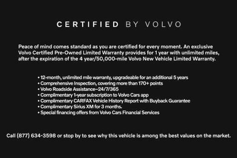 * 1-Year complimentary Volvo On Call app. Remote climate control, locks, fuel, maintenance & driving journal. Vehicle History Report with Buyback Guarantee. Includes Trip Interruption Reimbursement. Every Certified by Volvo Fully Electric & Plug-in Hybrid Comes With an 8-Year/100,000-Mile Battery Warranty.